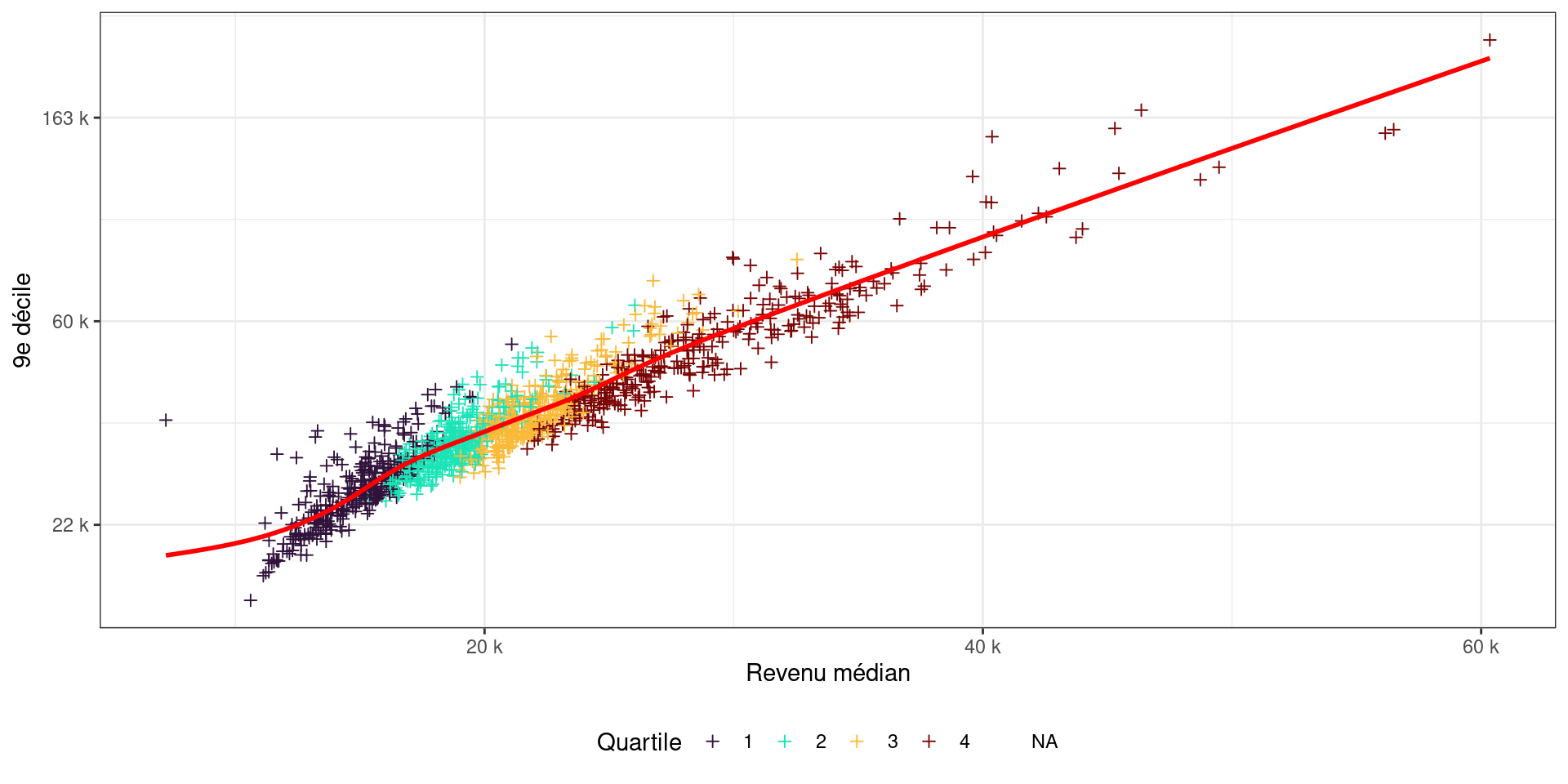 labs(x = "Revenu médian", y = "9e décile", color = "Quartile") +